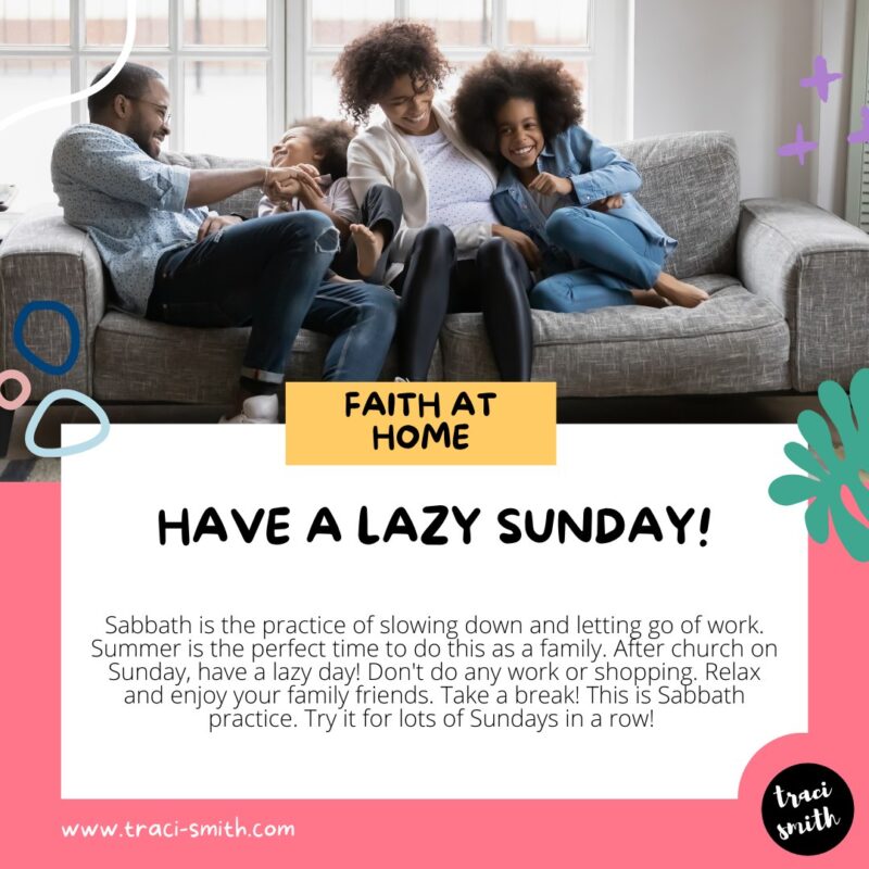 Sabbath is the practice of slowing down and letting go of work. Summer is the perfect time to do this as a family. After church on Sunday, have a lazy day! Don’t do any work or shopping. Relax and enjoy your family and friends. Take a break! This is Sabbath practice. Try it for lots of Sundays in a row!