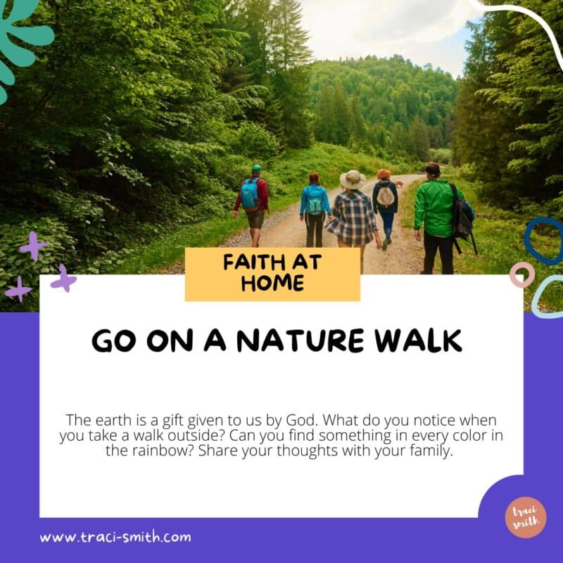 The earth is a gift to us by God. What do you notice when you take a walk outside? Can you find something in every color in the rainbow? Share your thoughts with your family.