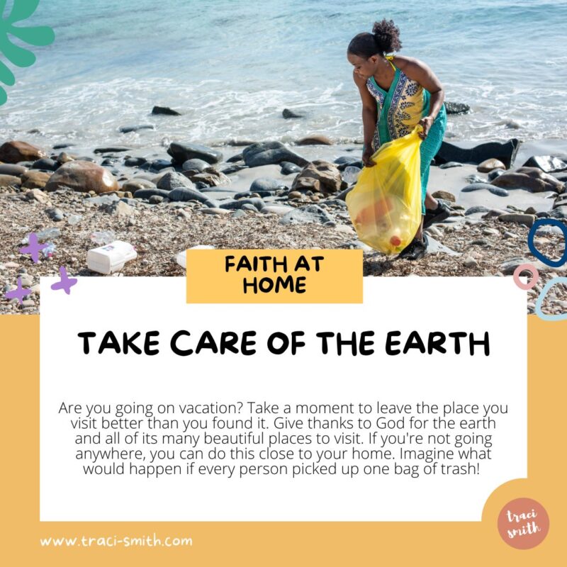 Are you going on vacation? Take a moment to leave the place you visit better than you found it. Give thanks to God for the earth and all of its many beautiful places to visit. If you’re not going anywhere, you can do this close to your home. Imagine what would happen if every person picked up one bag of trash!