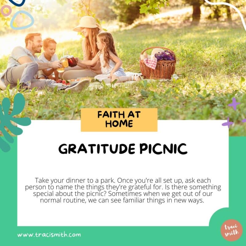 Take your dinner to a park. Once you’re all set up, ask each person to name the things they’re grateful for. Is there something special about the picnic? Sometimes when we get out of our normal routine, we can see familiar things in new ways.